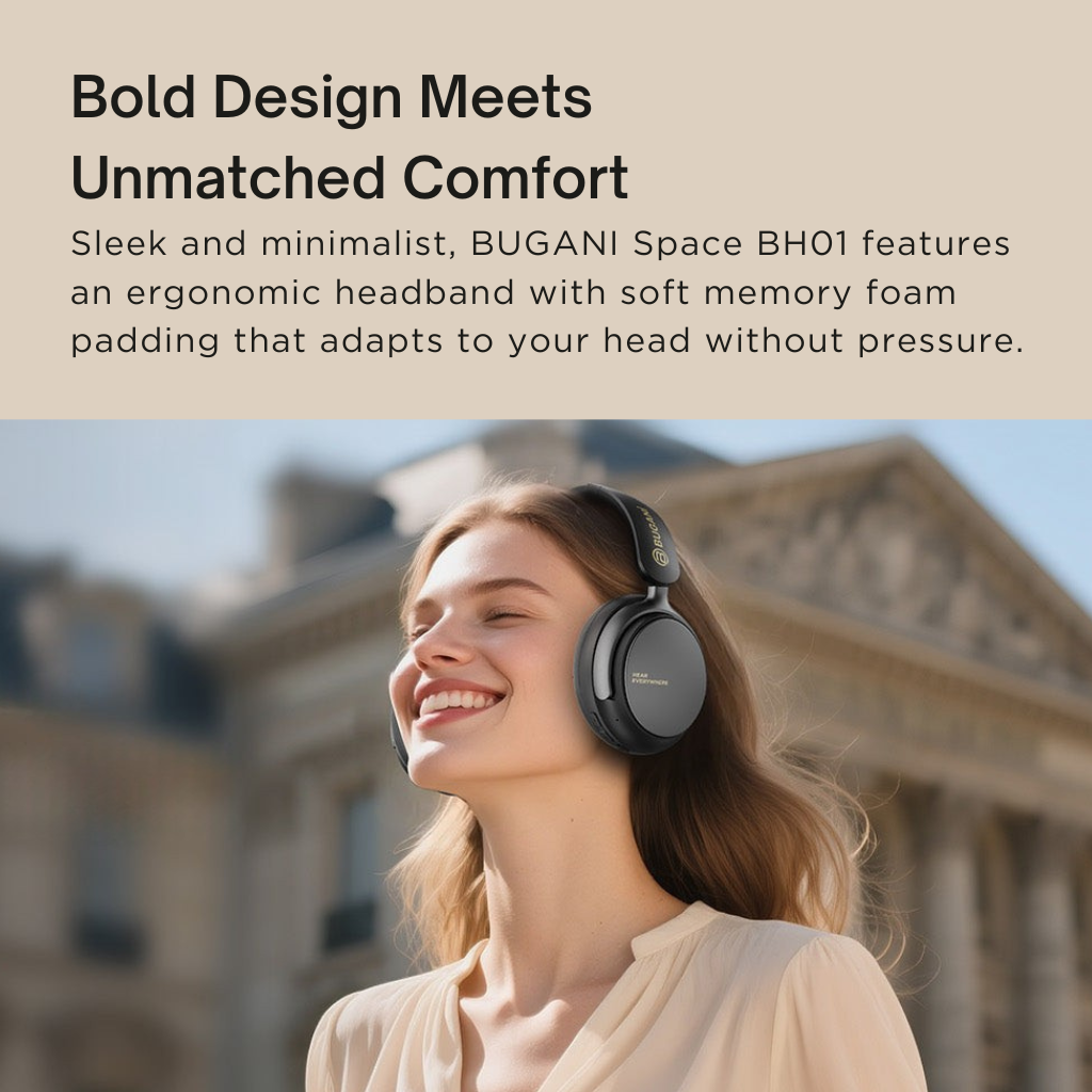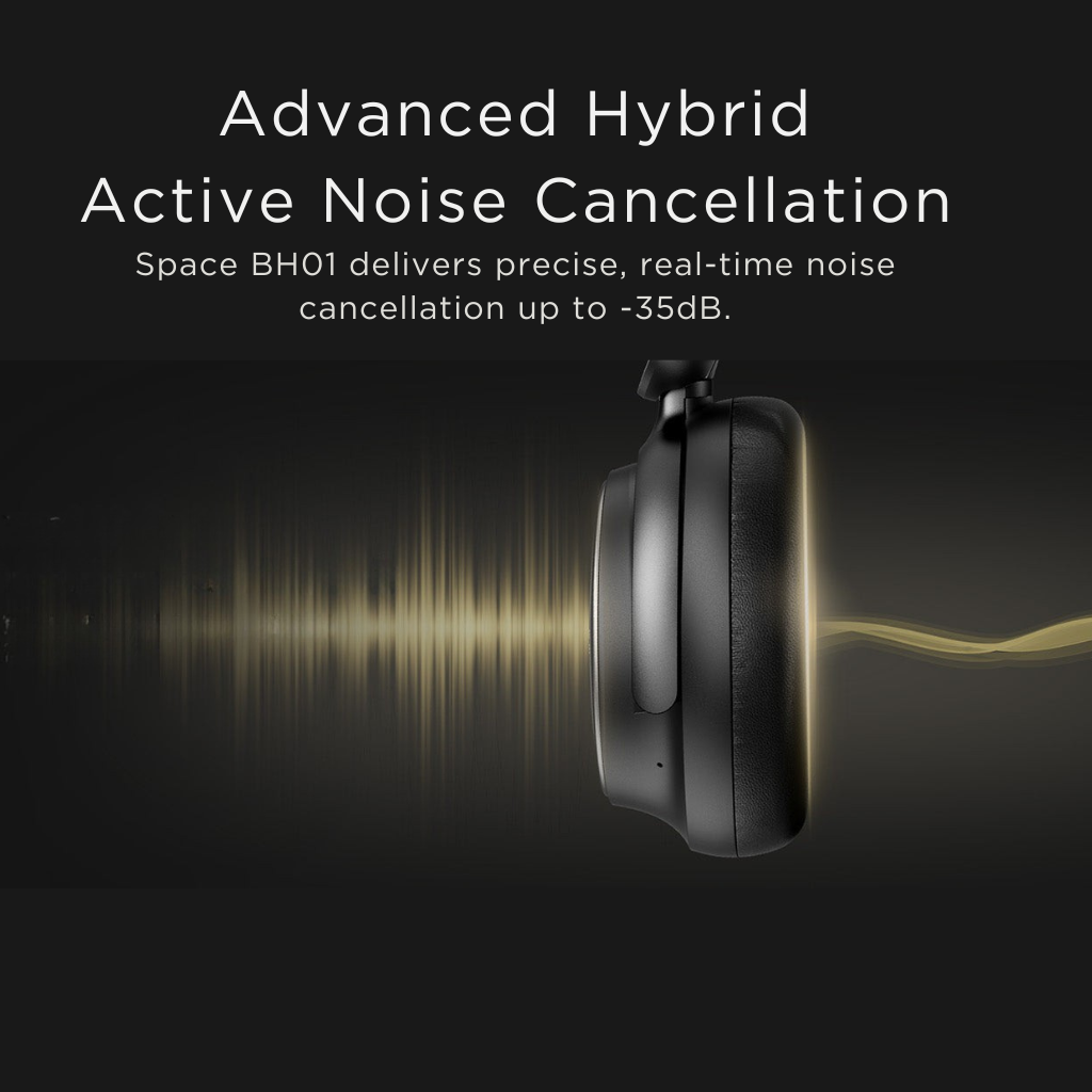 Hibridinis aktyvus triukšmo slopinimas. Bugani Space BH01 ausinės leidžia visiškai pasinerti į muziką ar pokalbį, eliminuodamos pašalinius garsus iki –35 dB. Galite rinktis iš kelių režimų: pilno triukšmo slopinimo, skaidrumo (kai reikia girdėti aplinką) arba standartinio, kad garsą prisitaikytumėte prie bet kokios situacijos – kelionės, darbo ar pasivaikščiojimo mieste.