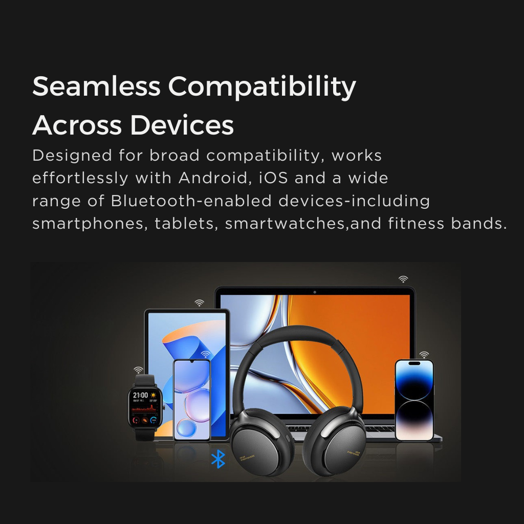 Platus suderinamumas. Ausinėse įdiegtas naujausias „Bluetooth 6.0“ modulis, todėl jos lengvai jungiasi prie įvairių įrenginių – išmaniųjų laikrodžių, telefonų, planšečių, kompiuterių. Nesvarbu, ar klausotės muzikos „iOS“ ar „Android“ telefone, jungiatės prie nešiojamojo kompiuterio vaizdo konferencijoms, ar žiūrite filmą planšetėje, ausinės užtikrina stabilų ryšį, greitą suporavimą ir skaidrų garsą be trikdžių.