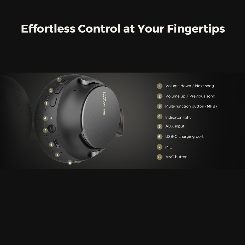 Įspūdingas baterijos veikimo laikas. Vos 2 valandų įkrovimas suteikia net iki 120 valandų muzikos atkūrimo arba 100 valandų pokalbių (naudojant vidutinį garsumą ir išjungtą ANC). 750 mAh talpos baterija užtikrina, kad ausinės tarnaus ištisas dienas be papildomo įkrovimo. Įkrovimui naudojama universali USB-C jungtis, todėl jas patogu įkrauti bet kur.