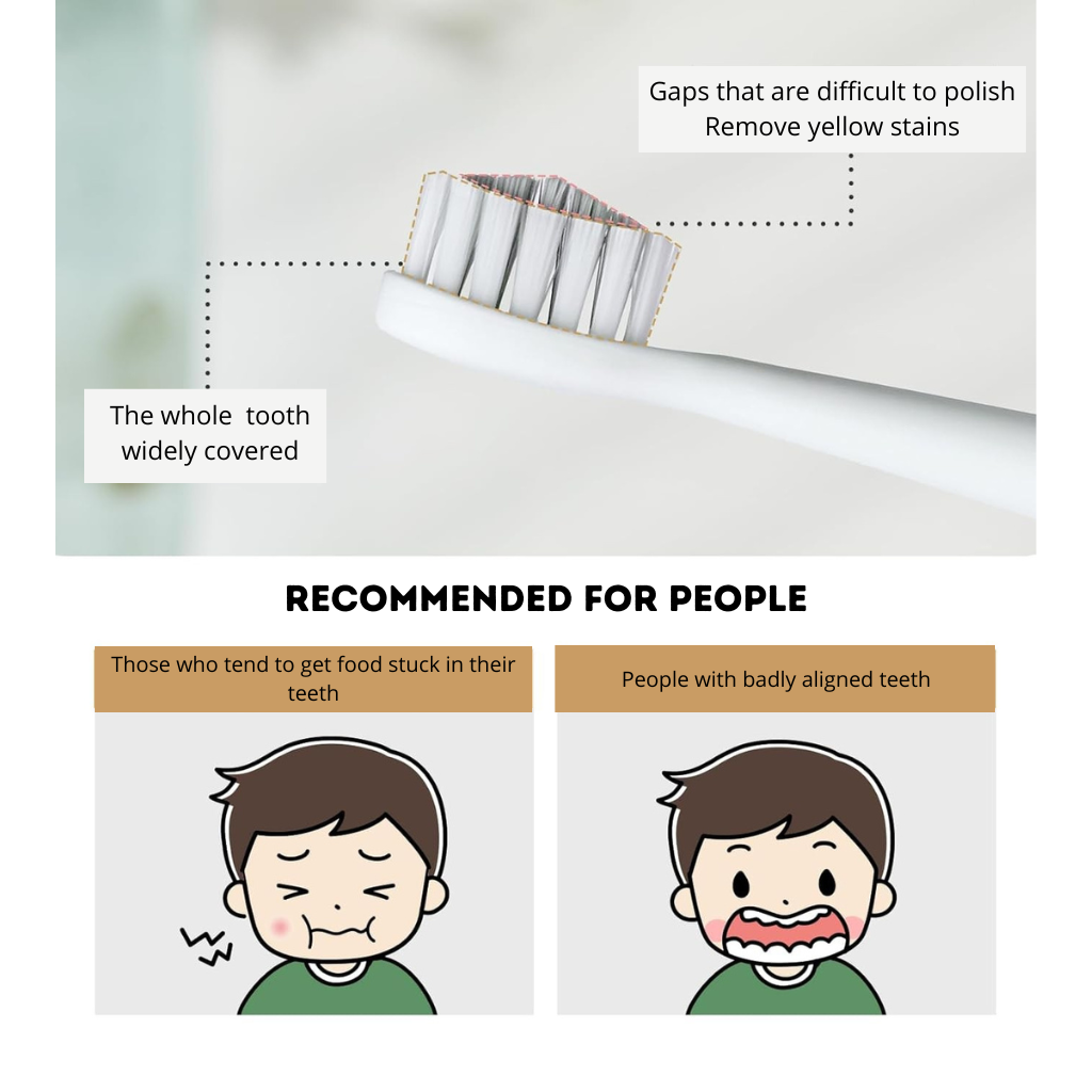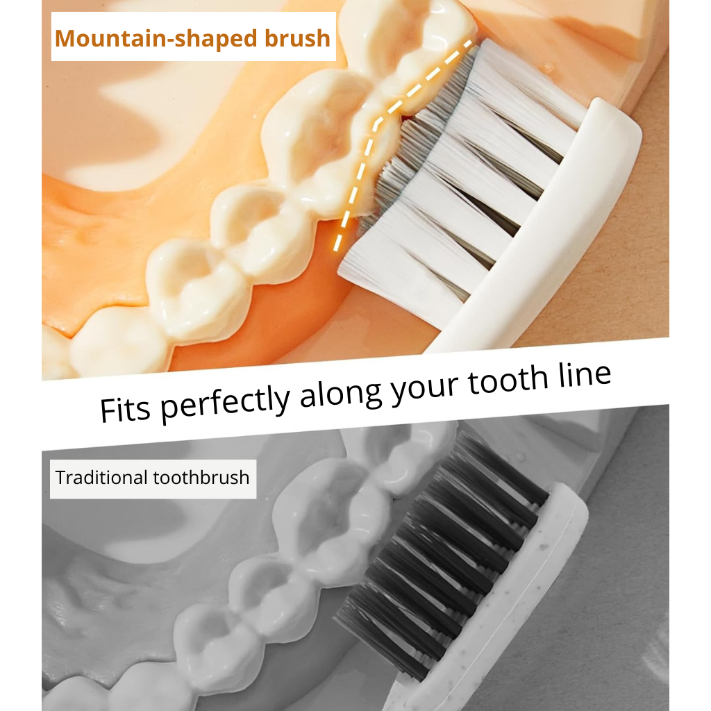 Unikalus „Chevron“ formos šepetėlio dizainas leidžia šereliams lengvai pasiekti net sunkiai prieinamas vietas tarp dantų, užtikrinant kruopštų valymą be papildomų pastangų. Dėl apvalių šerelių galiukų dantys valomi švelniai, nepažeidžiant dantenų.