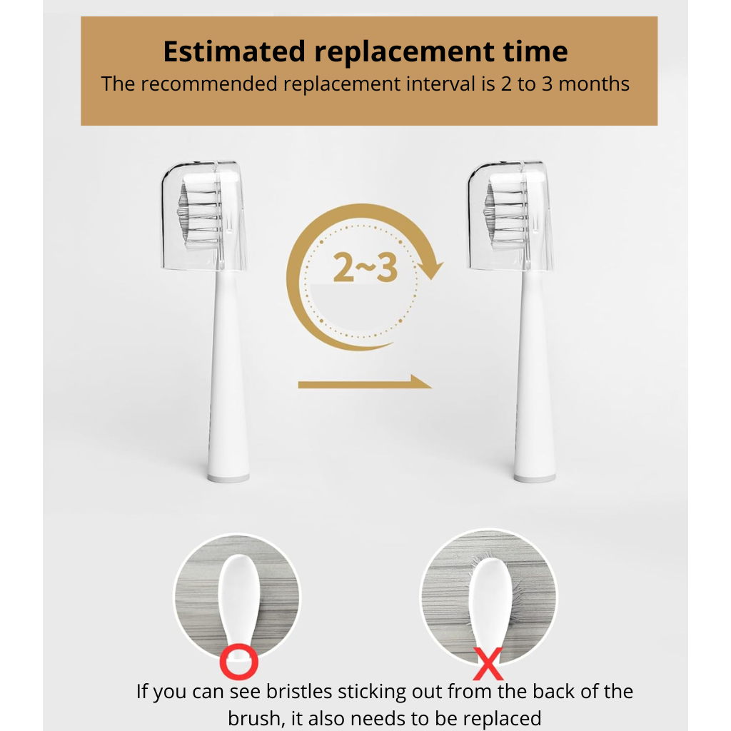 Antgaliai lengvai užsukami ir nuimami, todėl jų keitimas – greitas ir patogus. Rekomenduojama juos keisti kas 3 mėnesius, kad būtų užtikrintas maksimalus valymo efektyvumas. Kiekvienas antgalis tiekiamas su apsauginiu dangteliu, saugančiu nuo dulkių ir bakterijų – idealus pasirinkimas kelionėms.