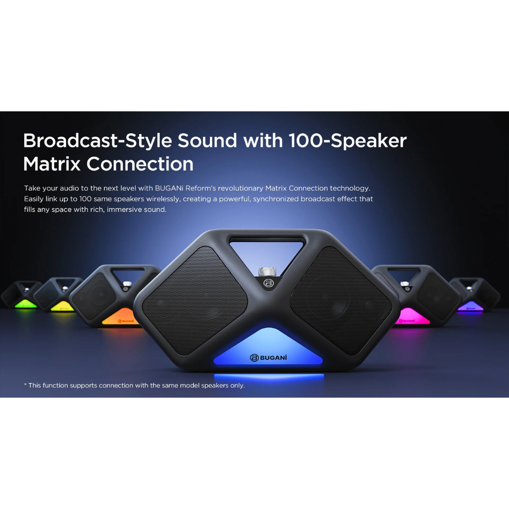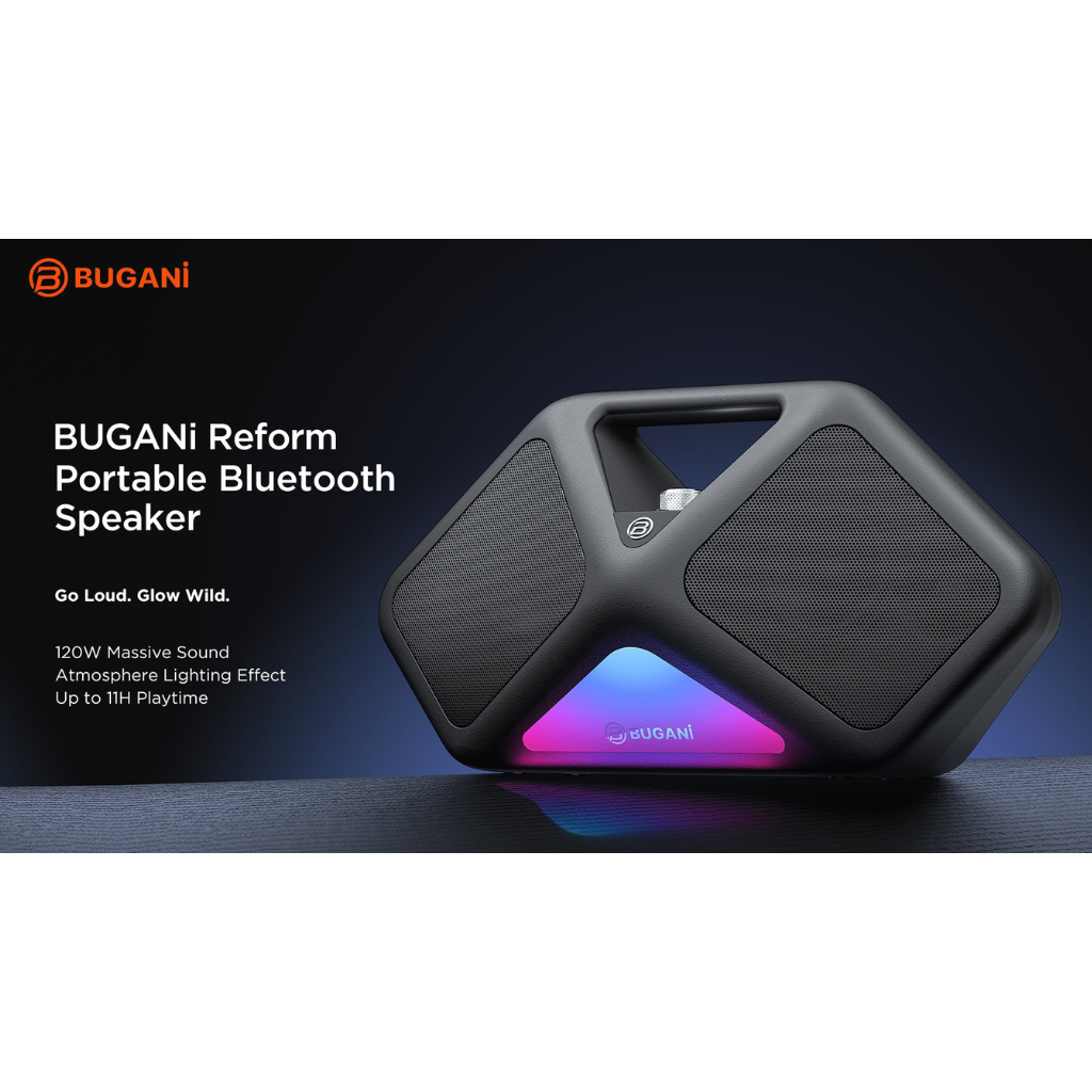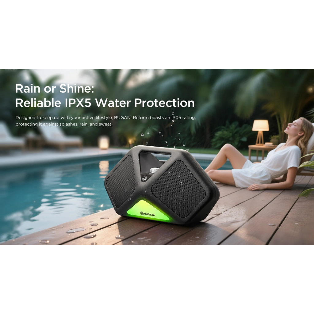 - Radīts aktīvai dzīvei. “Bugani Reform M196” atbilst IPX5 ūdensizturības standarta prasībām, tāpēc tam nav bīstams ne lietus, ne ūdens šļakatas. Izturīga konstrukcija un minimālistisks dizains padara to par ideālu sabiedroto gan mājās, gan ārā. Papildu atmosfēriskais apgaismojums piešķir īpašu vizuālu efektu ballītēm.