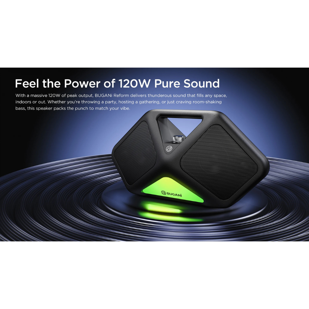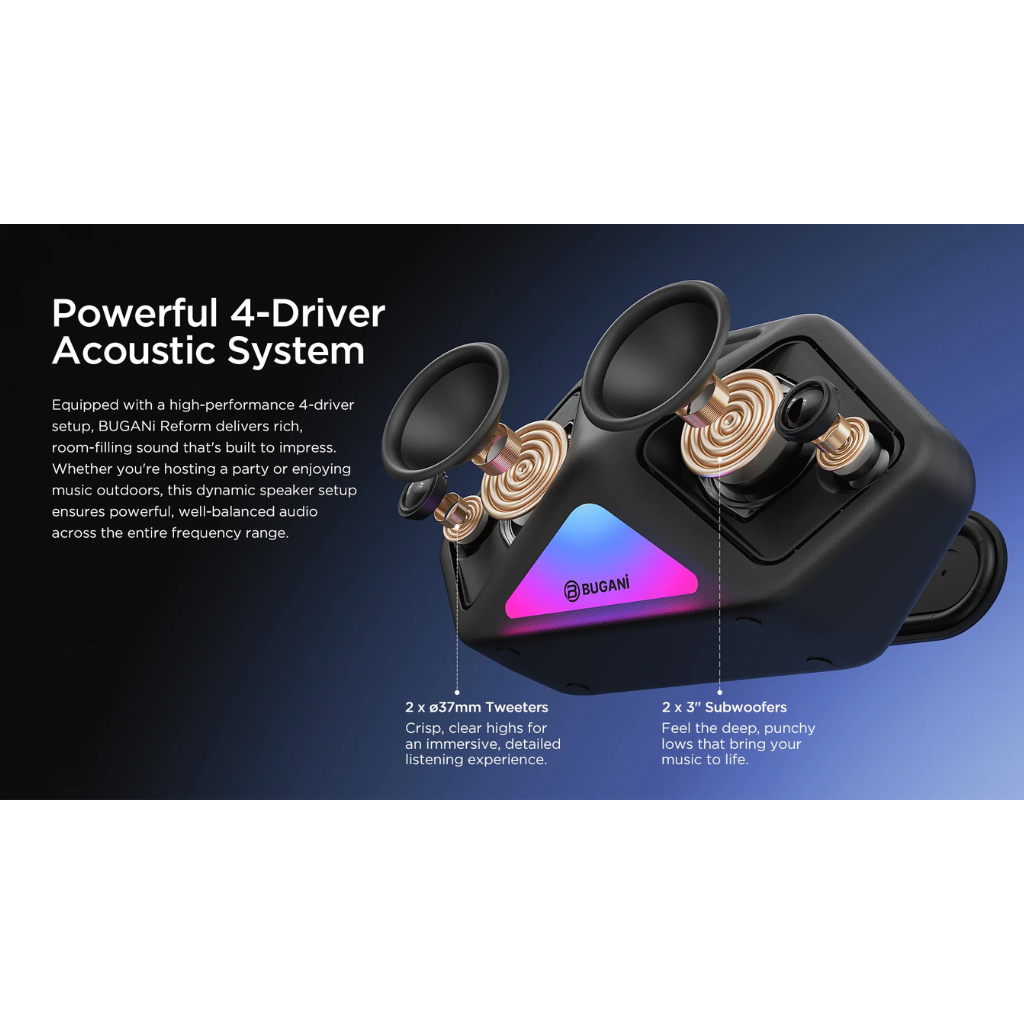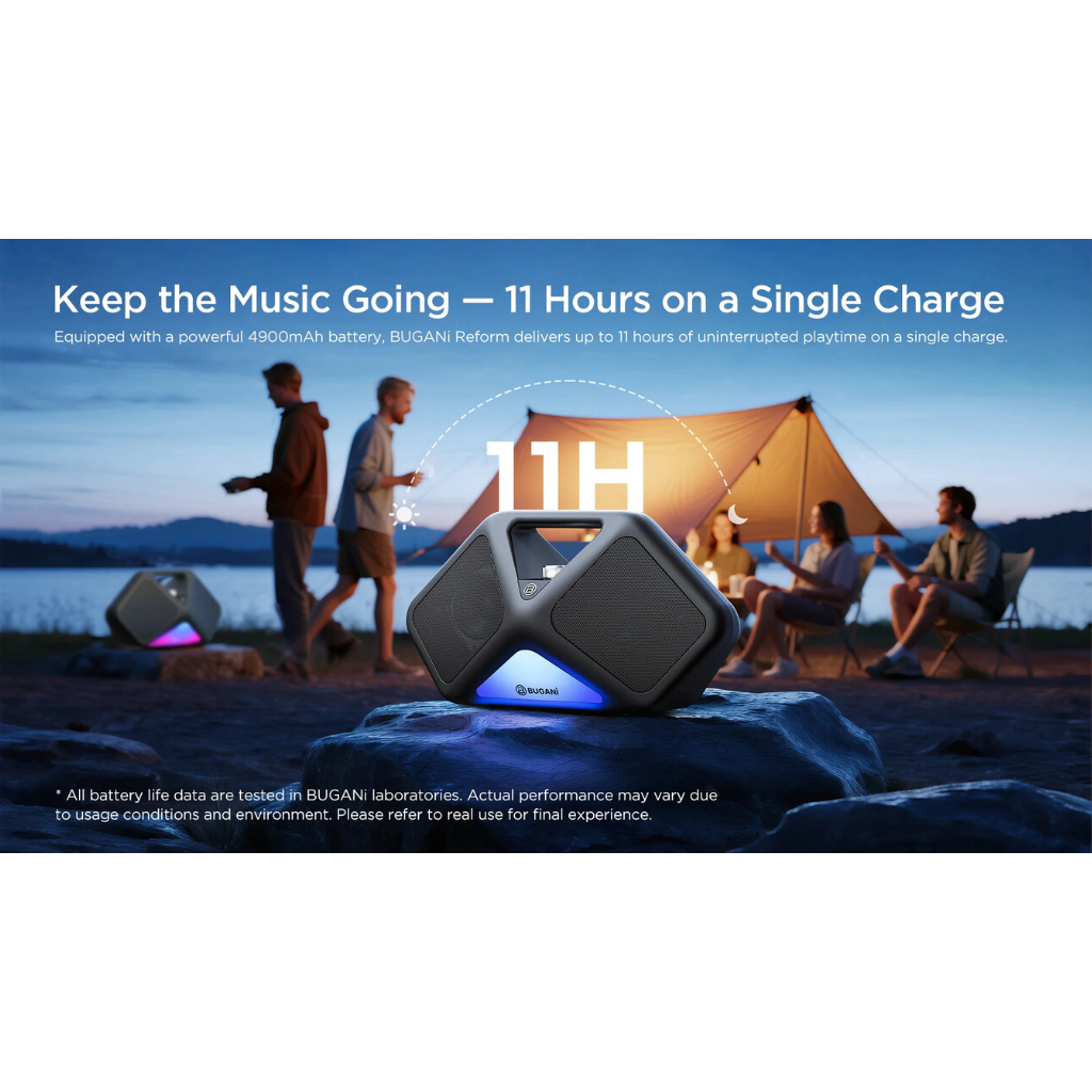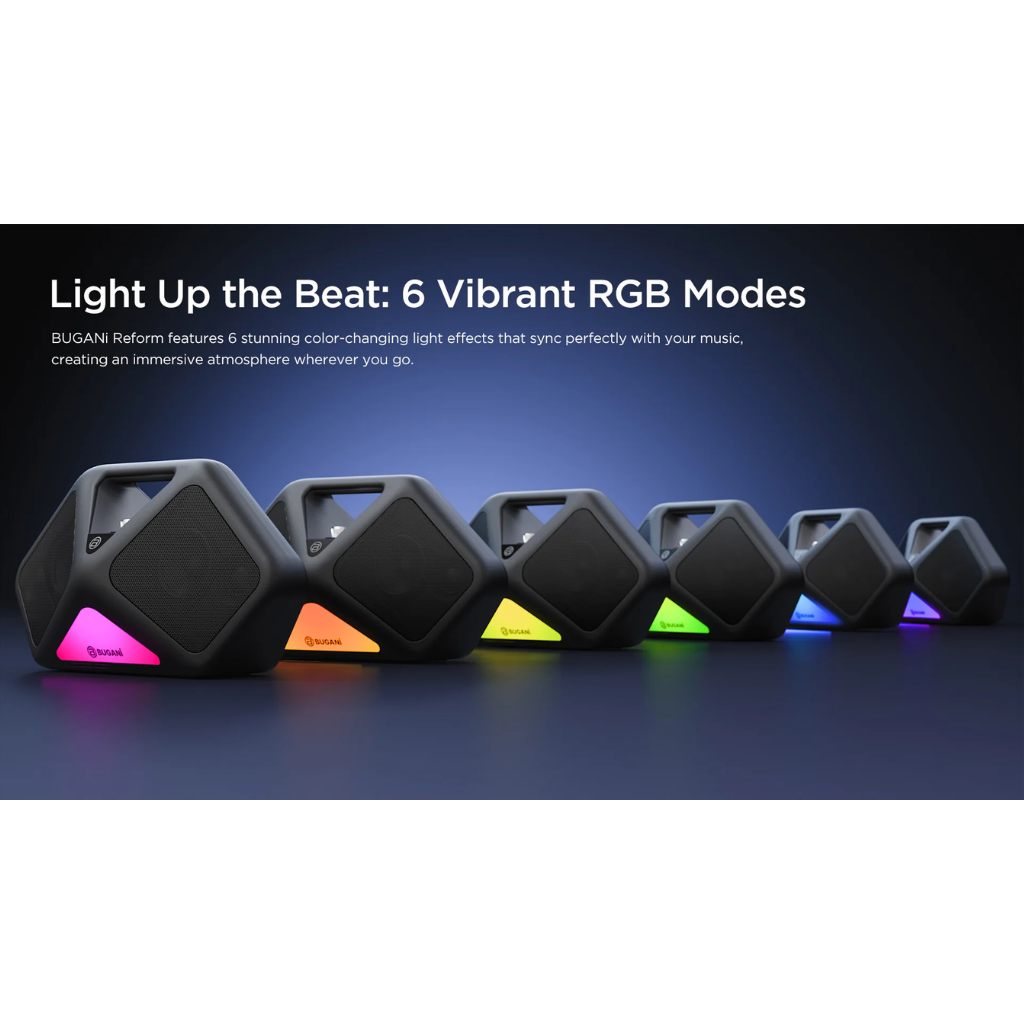 - Radīts aktīvai dzīvei. “Bugani Reform M196” atbilst IPX5 ūdensizturības standarta prasībām, tāpēc tam nav bīstams ne lietus, ne ūdens šļakatas. Izturīga konstrukcija un minimālistisks dizains padara to par ideālu sabiedroto gan mājās, gan ārā. Papildu atmosfēriskais apgaismojums piešķir īpašu vizuālu efektu ballītēm.